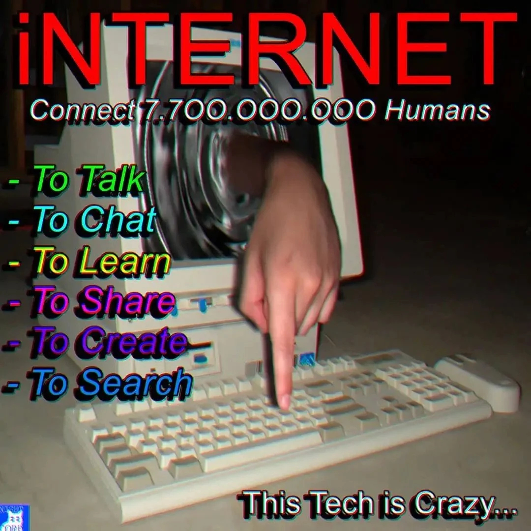 A person pressing a key on a vintage computer keyboard with a monitor behind displaying the word 'INTERNET' in large red letters and a hand coming out of the monitor. Text overlay explains internet functions and describes the technology as crazy.
